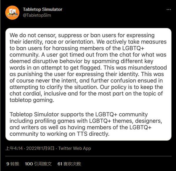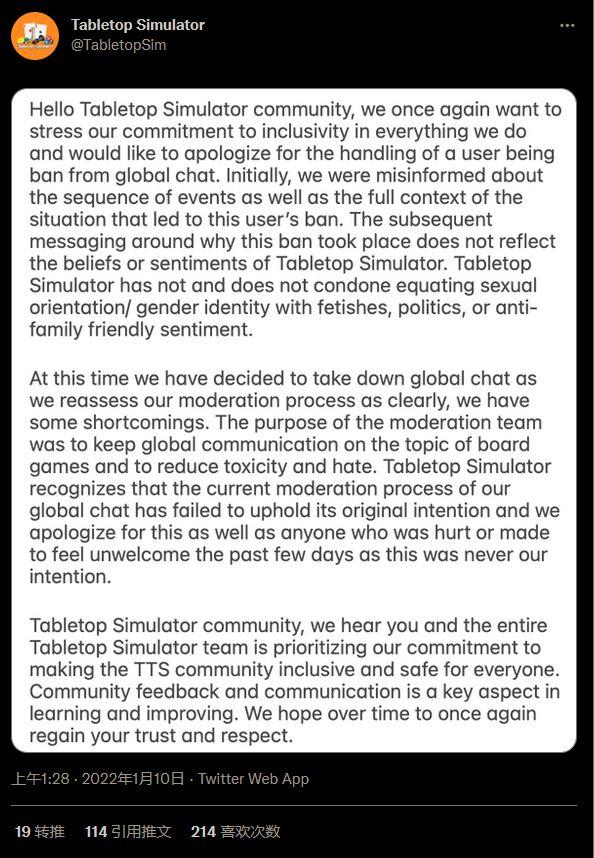 “审核团队的目的是保持全球对棋盘游戏主题的交流,并减少攻击和仇恨,”该工作室表示:“《桌游模拟器》认识到我们当前的公共聊天审核过程未能维护其初衷,我们为此以及过去几天受到伤害或感到不受欢迎的任何人道歉,因为这绝不是我们的意图。”