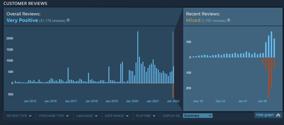 与总体总数相比,这些差评轰炸的评论数量相对较少:自 1 月 8 日以来,有 674 条负面评论和 568 条正面评论,这是桌面模拟器自 2015 年推出以来近 30,000 条“绝对正面”用户评论中的一小部分。尽管如此,突然涌入足以触发 Steam 的自动反评价轰炸系统:1 月 7 日之后发布的所有用户评论,无论是正面的还是负面的,都被标记为“离题”,这意味着它们将保持可见但不会影响评论分数的计算。