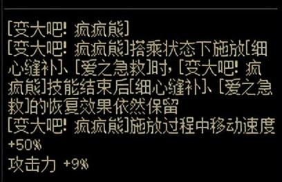 这个技能可增加“禁忌诅咒与偏爱”的持续时间,技能好了小伙伴们就能使用让其对着队友喷。除此外,由于这个技能为脱手技能,搭配“二觉被动”减抗使用也很不错。例如,进boss后先放“咆哮吧!疯疯熊”,再放“死命召唤与觉醒”,也能让队友能在觉醒动画期间吃到“二觉被动的减抗效果”。