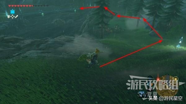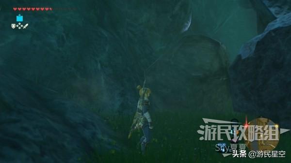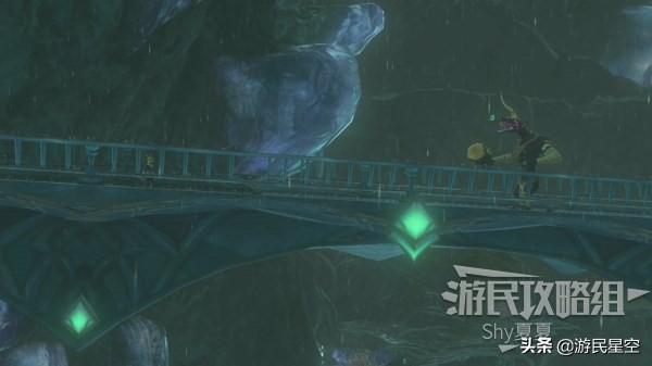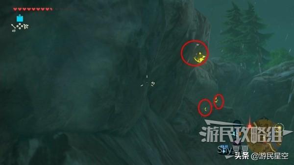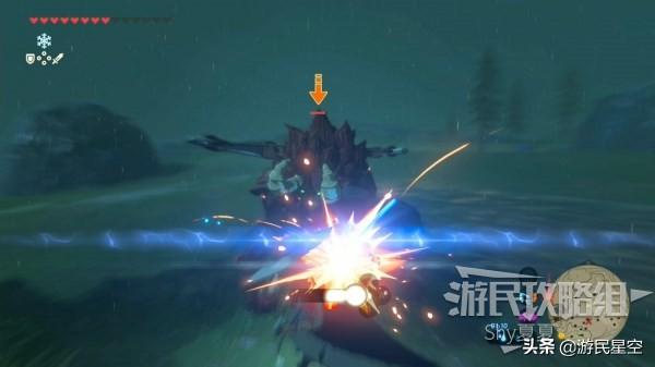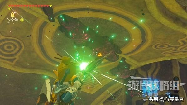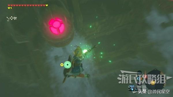 每当下几波进攻,希多会带我们到瀑布下方,冲上去打开滑翔伞,瞄准进入林克时间,换上电箭,射下图红色的点即可,一共有四个,每次打一个,全部打完就OK了!