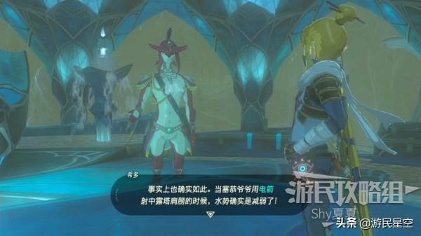 通过神庙试炼后,去上层与族长对话,如果想要打败水神兽就需要电箭,并给予我们卓拉铠甲,有了这个铠甲就可以顺着瀑布向上走了(记住是顺着瀑布的水,而不是瀑布旁边没有水的墙)。