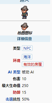 在第一次遇到渔夫时,他还是沉睡渔夫,随机睡在海洋生物群落的沙滩或水面上。当如下条件满足时他会搬进来: