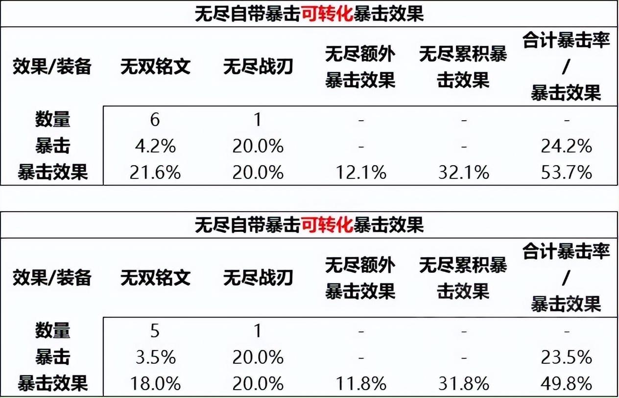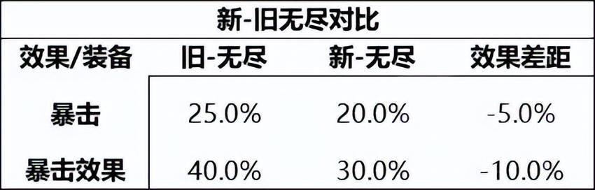 无尽自身20%暴击率也可转化为暴击效果,也就是开局可自带30%暴击效果,整体属性对比旧无尽降低了5%暴击率,降低了10%暴击效果,如图: