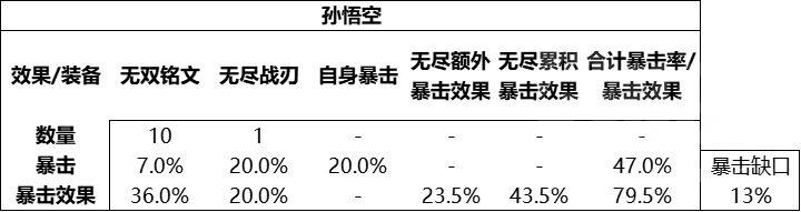 猴子第一件出无尽,加上无双铭文,可以看到47%暴击率,79.5%的暴击效果,13%暴击率缺口。和赛季前对比一下,出了无尽了,52%暴击率,76%暴击效果。