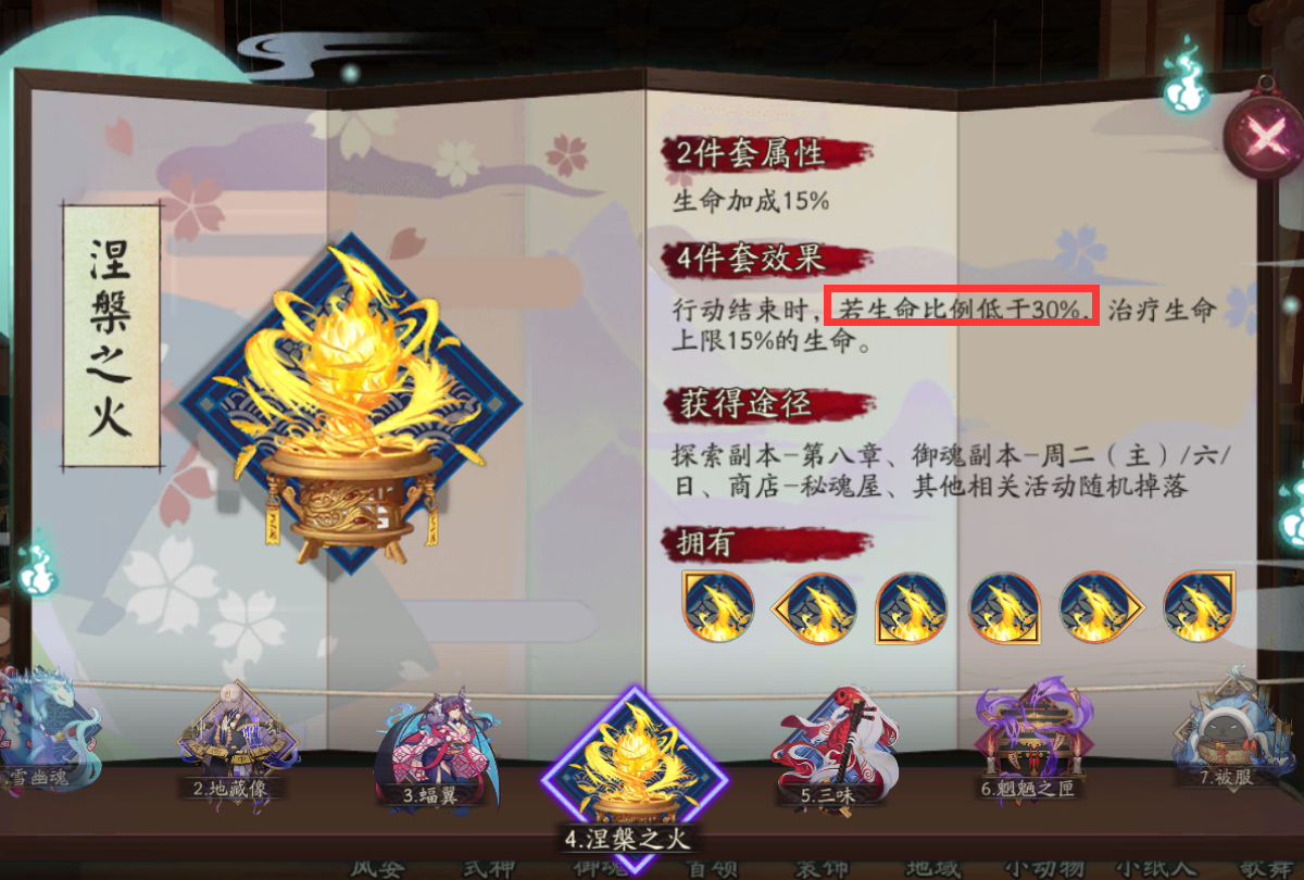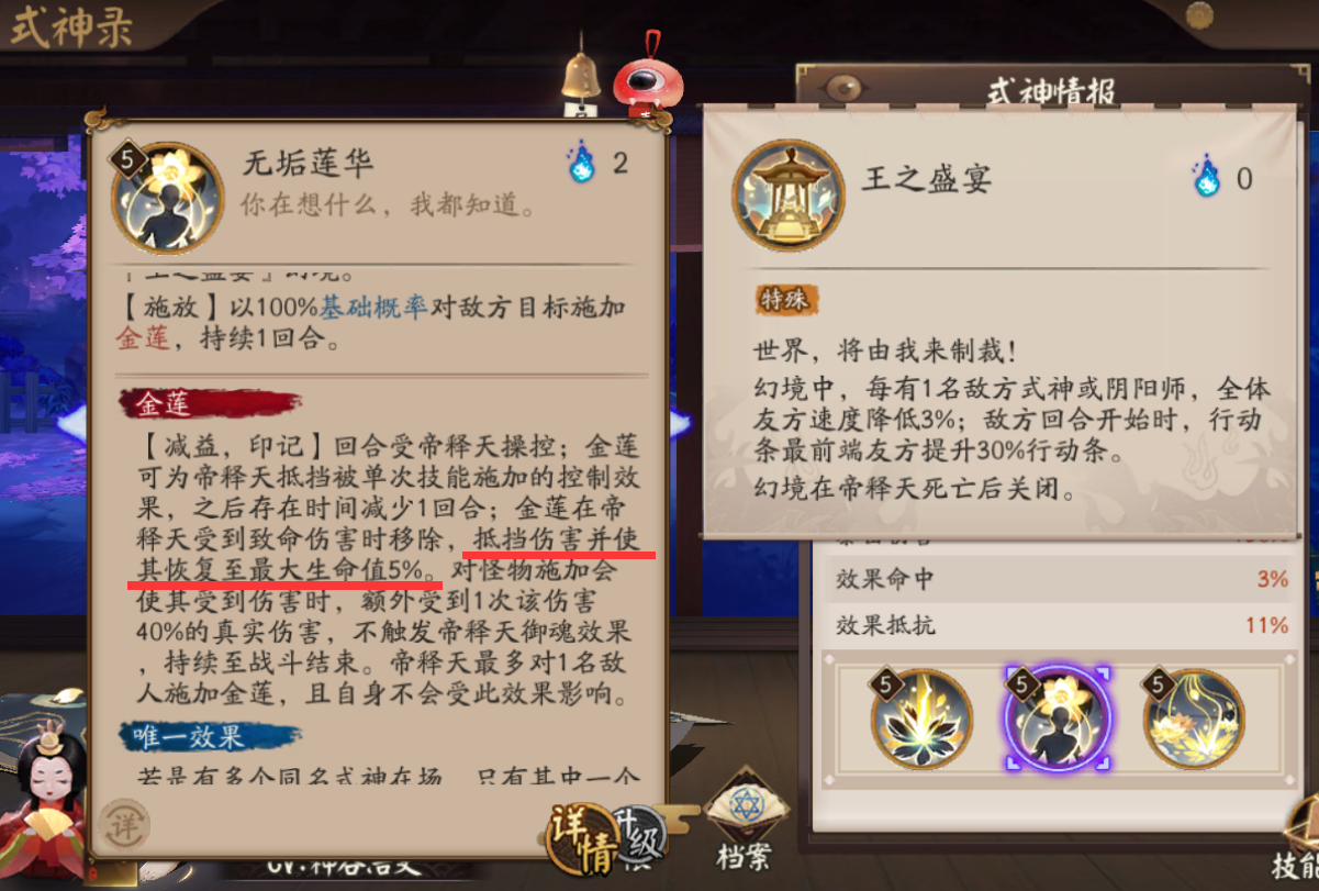 拿小然我亲自经历的一盘斗技来举例,我用的是日女双奶岚、敌方帝释天冲浪,前期我把浪川和敌方除了帝释天之外的全部式神都拔掉了,最后却被仅留在站场上的帝释天用涅槃之火活生生耗死了......毕竟这个御魂的机制很特殊,它的效果哪怕是非自身回合都能出发,只要达到了标准血线,帝释天金莲被打掉后触发AOE时也可以回血。