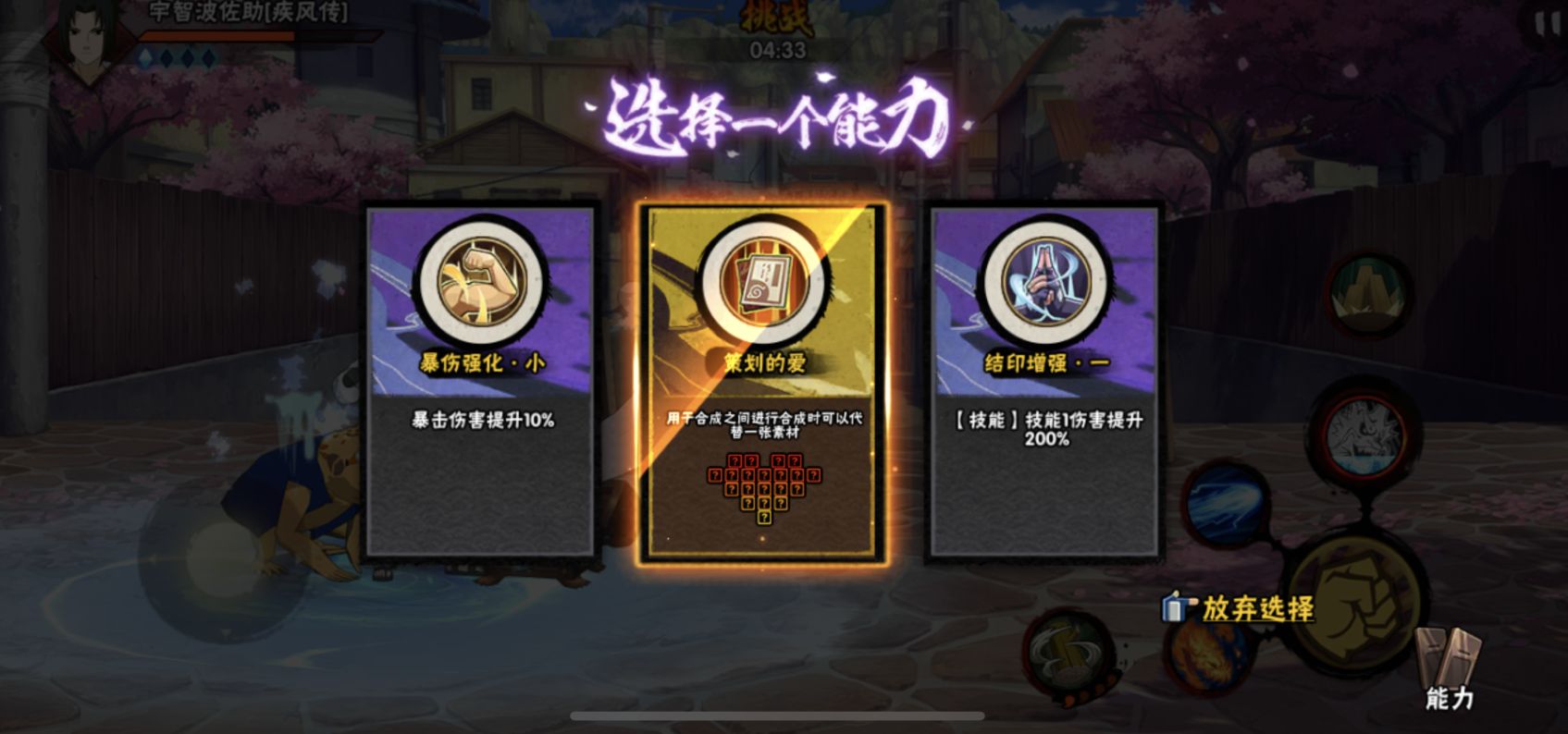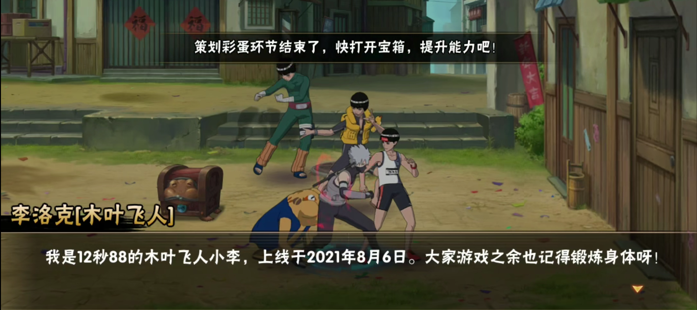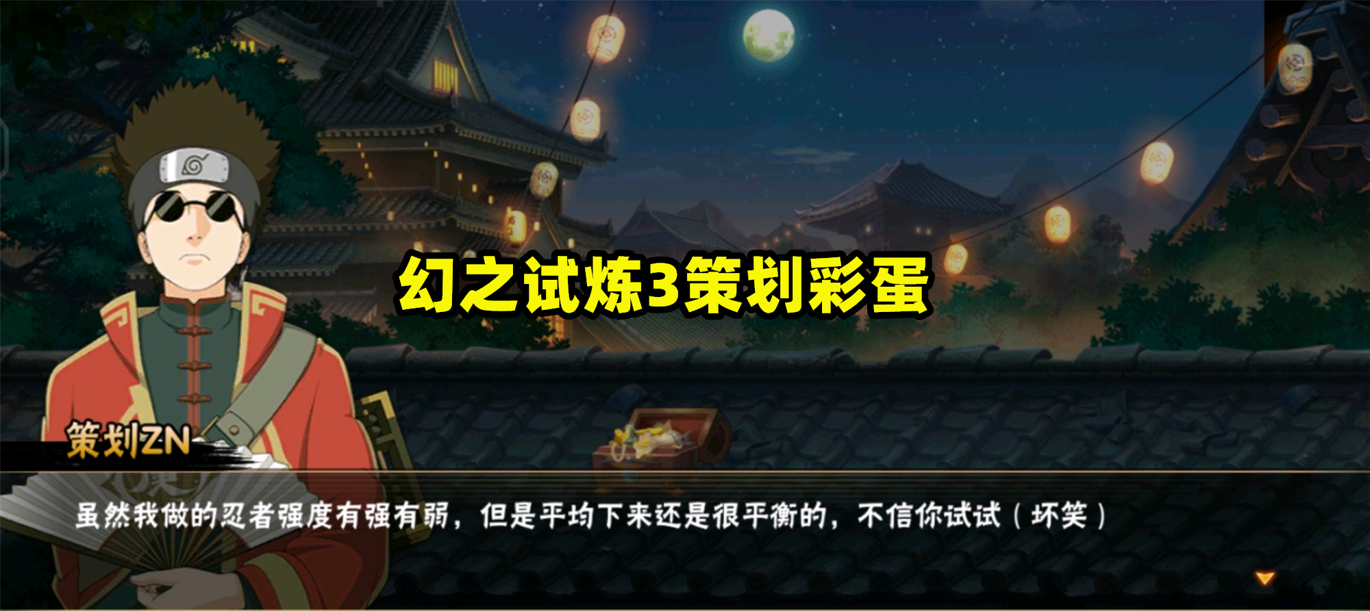 最后就是策划千代的彩蛋关卡,刚开始的时候就会直接透露说他自己最近在设计一个新的忍者,然后就让你回答问题,答对了就告诉你。这个问题也比较简单,他会问你策划千代自认为最满意的忍者是哪个,一个选项是青春哥忍界大战凯,另外一个选项是漂泊武士再不斩。好像无论选择哪一个,他都会说你选错了,然后就会直接出现另外一个选项里提到的忍者跟你对战。当你战胜了以后,策划千代就开始“耍赖”了,他还是说不能透露具体是什么忍者,但会给你一个宝箱作为补偿。