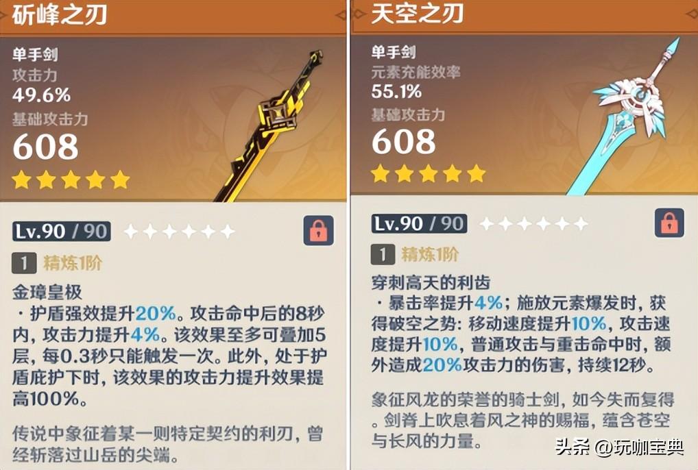 这是个副属性为49.6%攻击力的单手剑。主属性的608攻击力,在其他五星单手剑中,属于中流水平。和天空之刃一个级别。此外,和目前的最强单手剑,“雾切之回光”相比,攻击力是不如的,因为“雾切之回光”有674的攻击力。这也是“风鹰剑”的攻击力。对比,综合排名,兼用性,在单手剑中应该排在第二的“磐岩结绿”也就是绿剑对比的话,比“磐岩结绿”的542攻击要高,不过“磐岩结绿”有着44.1%的暴击加成。