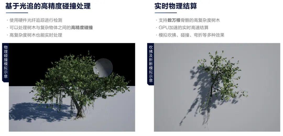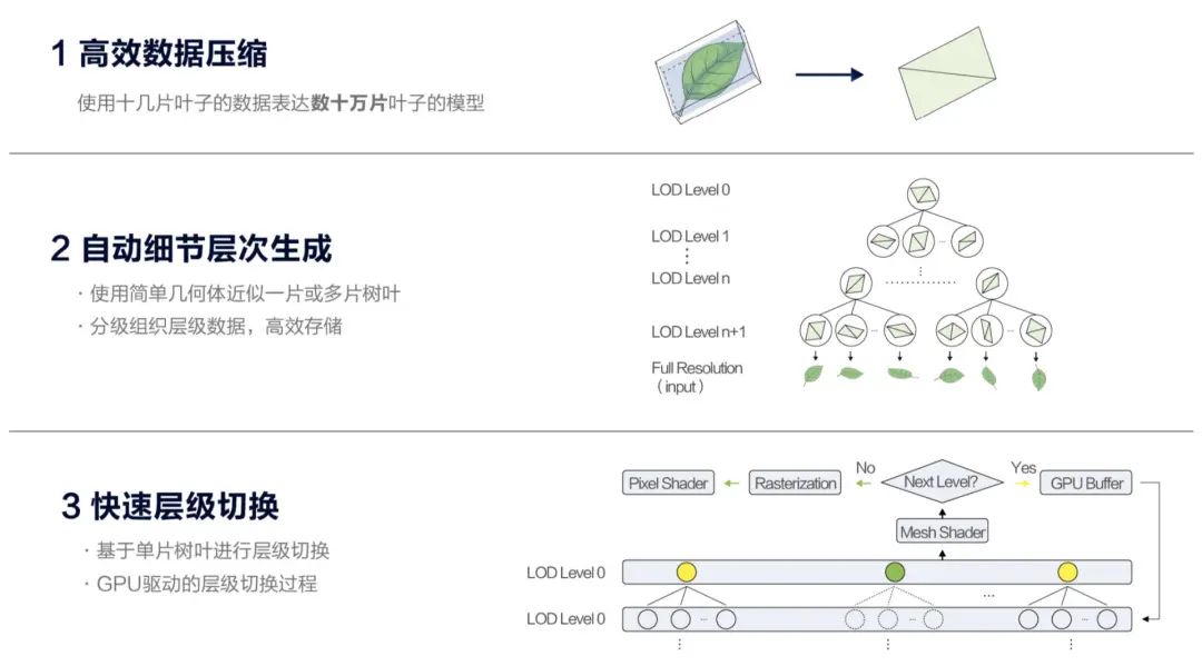 再比如,它可以通过压缩数据,用十几片叶子的数据表达数十万片叶子的模型,并使用简单几何体近似一片或多片树叶,分级组织层级数据,再给予单片树叶,实现GPU驱动的层级切换。最终一个地图可以承载上万棵树木,且每一片叶子都可以交互。