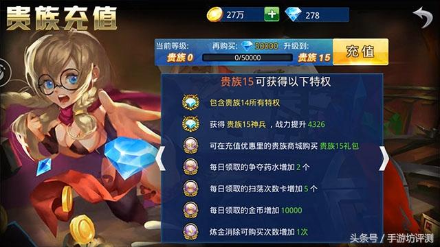 游戏存在VIP系统,在这款手游里叫做贵族,目前最高等级为贵族15,需要累积充值5000的RMB才能达到,并且还有贵族16的神秘特权;这款手游有做VIP的差异化体验,除去常见的体力购买和玩法次数更多等特权之外,还有专属的武器神兵会改变武器外观和大招形式,而且还会增加人物的战力,因此付费玩家跟免费玩家之间是存在竞技不平衡的因素的;