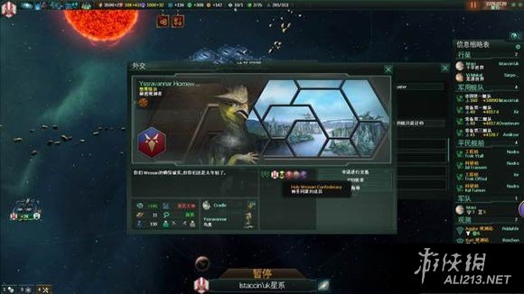 在这多项要素的旁边会显示出当前你处于的星系(已探索的范围内),你的各项要素的排名,排名越靠前,那么你的外交震慑力就越强,就意味着同盟会愿意听从你的指挥,未建交国也会对你的帝国忌惮三分。