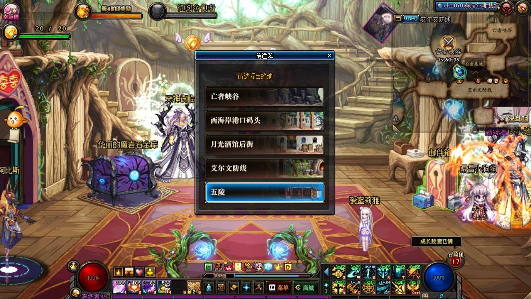 完成上述步骤后,传送阵新增五陵区域。通过赛丽亚小屋右侧的小门即可传送,玩家也正式进入这个神秘的国风城镇。