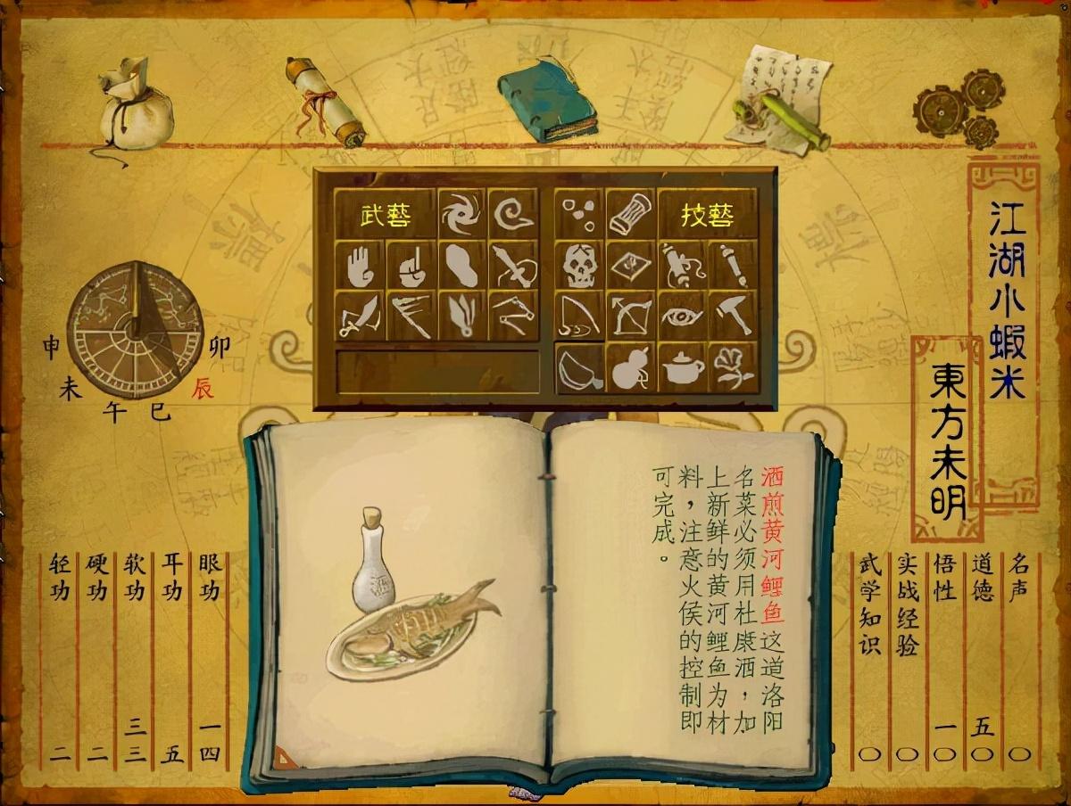第一年十一月上旬特殊商店-东方宝典(需2000钱,50武学)第一年十一月中旬功能新增(基本功-耳功)第一年十一月底剧情-初识秦红殇与秦红殇战斗,第二回合老胡增援。└┬1.收下银子(+20000钱)└2.拒绝接受(+15道德,青龙散)与护卫战斗,第二回合秦红殇增援。战龙兄虎弟,注意需用震退分开两人。└┬1.不救他(+3悟性)├2.帮他解开穴道└3.把花瓶弄倒(-10道德,+10悟性)第一年十二月上旬功能新增(生产-挖矿、打猎、钓鱼、采药,闲逛-森林、湖畔)新增闲逛事件(森林)1.初识江瑜(+10悟性,+10好感)第一年十二月中旬功能新增(生产-打铁)新增闲逛事件(逍遥谷)1.老胡传授打铁(技艺书-九环刀、紫晶笔)2.老胡传授打铁(技艺书-阴阳棍、碎宇刀)3.老胡传授打铁(技艺书-太皇、太虚剑、升龙棍)第一年十二月下旬功能新增(生产-厨艺)