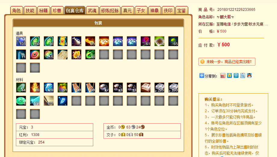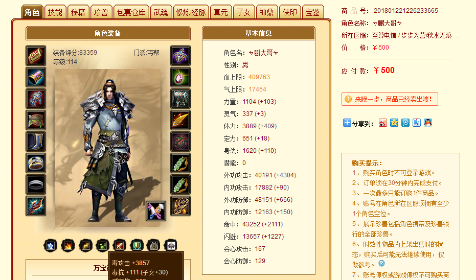 也就是说,我们把账号内的珍兽和各种不绑定的物品卖掉,换成元宝,再在平台上卖掉(100元基本上等于4500YB),此号内的珍兽和物品基本上就就值450元扣除手续费(约430元),那么我们再看看这个8.3W评分的裸号大概能值多少呢?