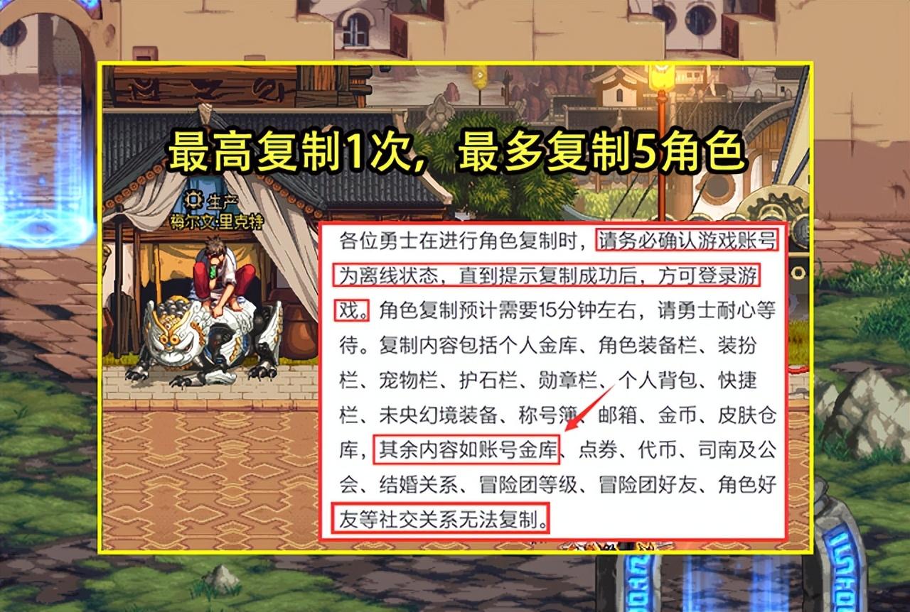在获得先遣服资格之后,就可以复制角色了!复制角色只能复制一次,最多可以复制5个角色,其中复制的规则,在4月8日梅尔文发布的“110级先遣服筹备进度分享”也公布的,复制角色需要确定为离线状态,复制需要15分钟走,复制内容包括个人金库、角色装备栏、装扮栏、宠物栏等等,基本上大部分的东西都复制过去了,但有一样东西却没有,那就是账号金库。
