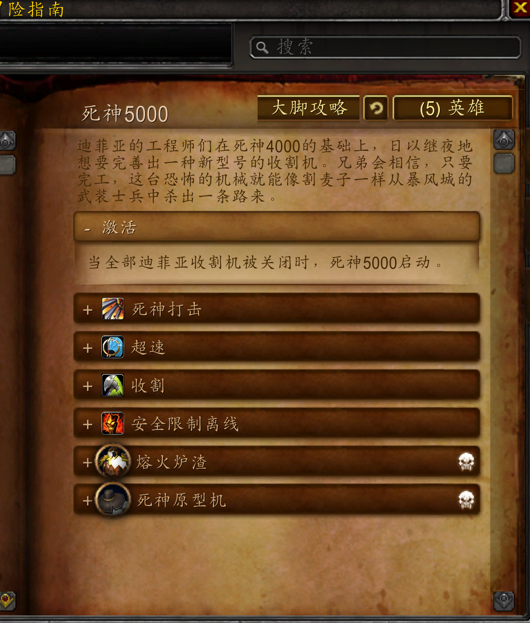 迪菲亚的工程师们在死神4000的基础上,日以继夜地想要完善出一种新型号的收割机。兄弟会相信,只要完工,这台恐怖的机械就能像割麦子一样从暴风城的武装士兵中杀出一条路来。