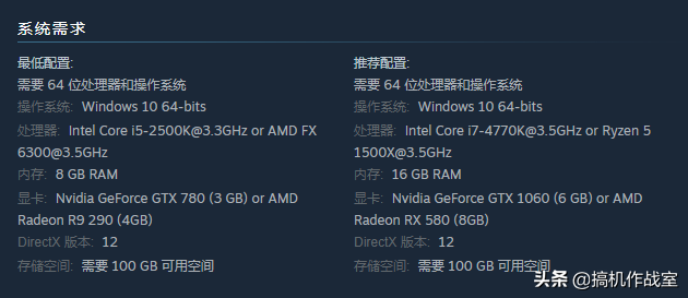 最低配置要求:四核i5处理器+8G内存+GTX 780显卡,与目前十代i5处理器+8GB+GTX 1650显卡配置的入门级游戏本差不多。