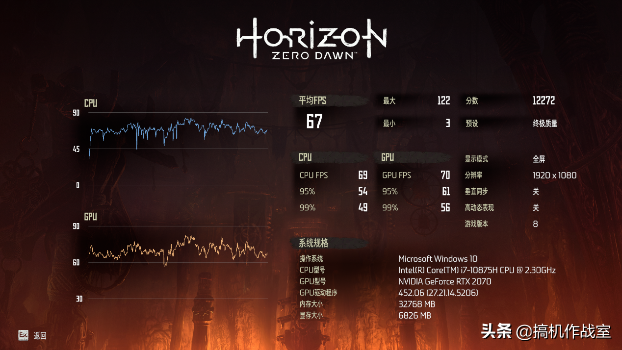 经过小编长时间的测试,以及游戏自带的基准测试,F117-X游戏本在《地平线:零之曙光》终极质量的画质设定下,平均帧数约为67 ,作为一款角色扮演类游戏,这个帧数结果是可以接受的。不过在整个测试过程中,实际帧数的变化幅度还是比较大,最大帧数高达122,最小帧数低至3,看来目前这款游戏的优化还是比较一般。希望厂商后期会增加相对应的补丁解决方案。