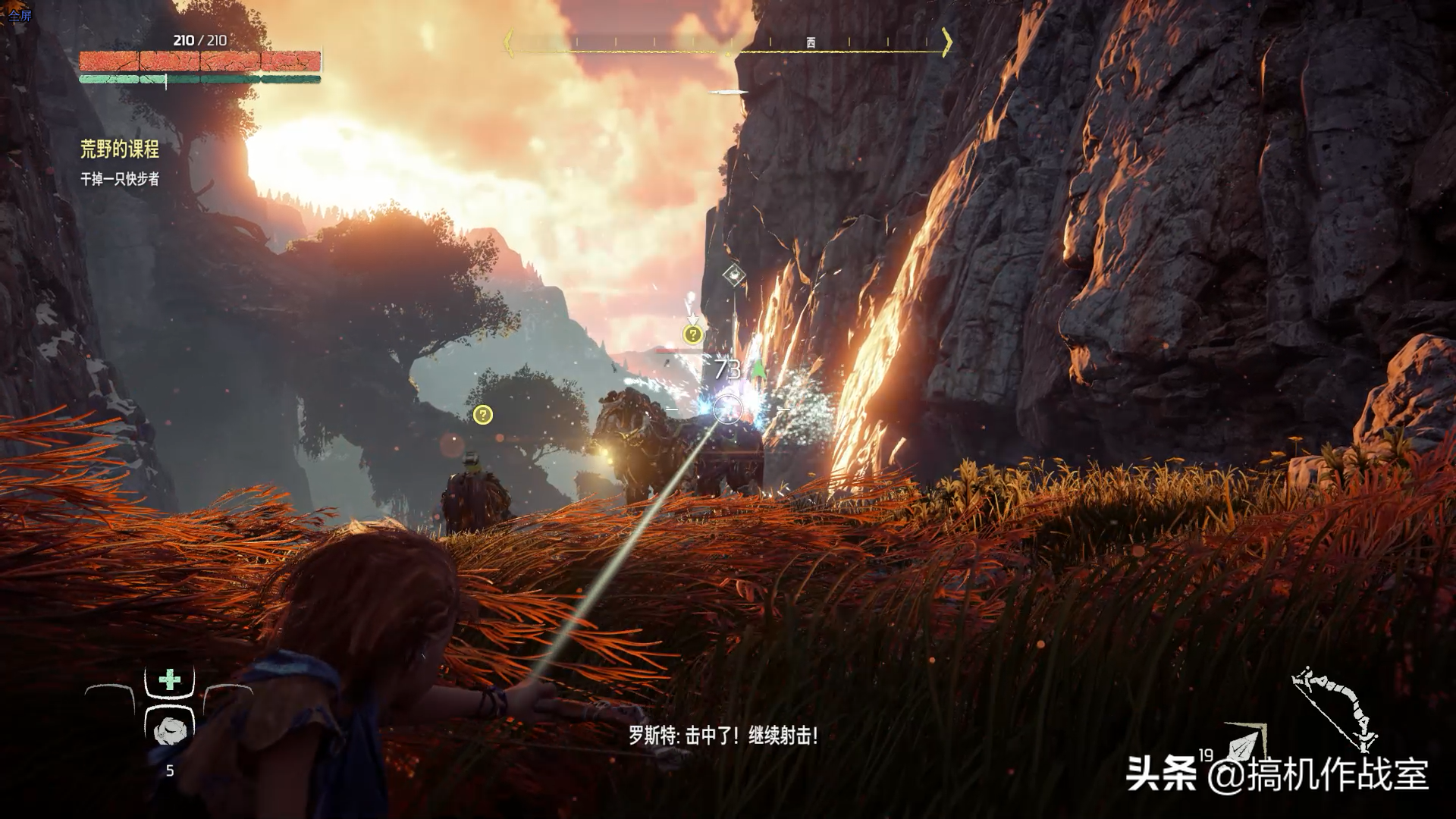 《地平线:零之曙光》的战斗系统十分有意思。女主埃洛伊可以通过头上装备的“Focus”来观察周边环境,不仅可以寻找任务线索和可采集道具,还能快速分析机械兽的弱点部位,类似于《巫师3》杰洛特的狩魔猎人感官的功能,给我的感觉就是攻略书般的存在。