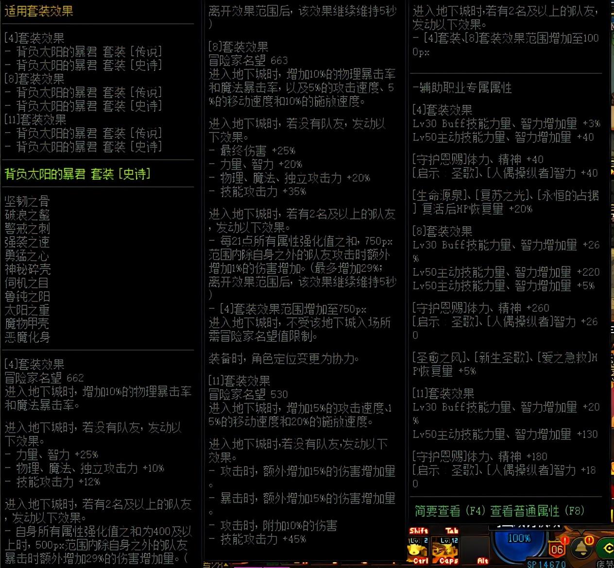 不同的巨龙套装备属性略有不同,目前buff效果最好、触发相对比较容易的是背负太阳的暴君套装、太阳下的女王套装、傀儡的往昔套装,建议小伙伴选择这几件巨龙套装备。
