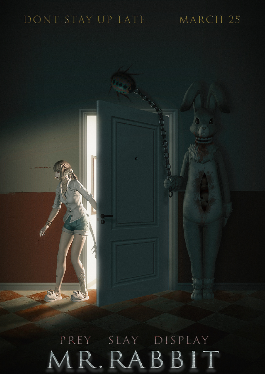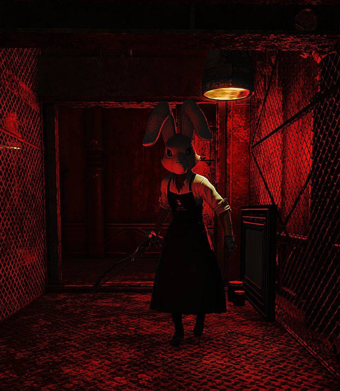 一些玩家在论坛里说出了自己的看法后,有些好事的玩家就开始了整活,把兔子人偶服玩出了花,不得不说,这样看来,兔子服确实很恐怖,颇有下饭电影里的变态杀人狂的感觉!