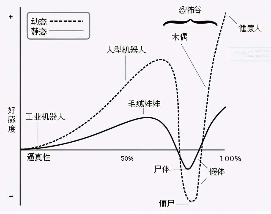 缘由就是“恐怖谷效应”,这是一个关于人类对非人物体感觉的学说,学者指出:由于机器人与人类在外表、动作上相似,所以人类会对机器人产生正面的情感,然而随着机器人和人类的相似程度达到一个特定值的时候,人类对他们的态度就会急转直下,机器人和人类之间的细微差别会显得极为显眼刺目,让人极度的恐惧,直到相似度继续上升,人们对机器人的情感再次回到正面态度。