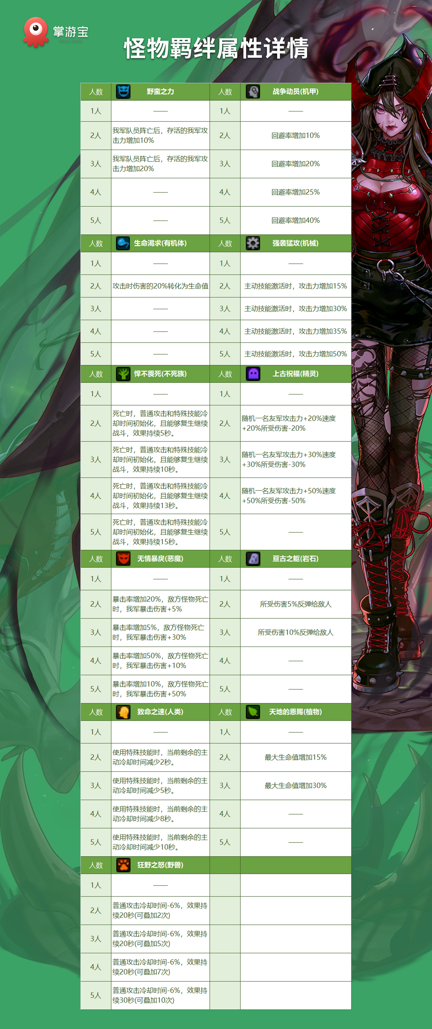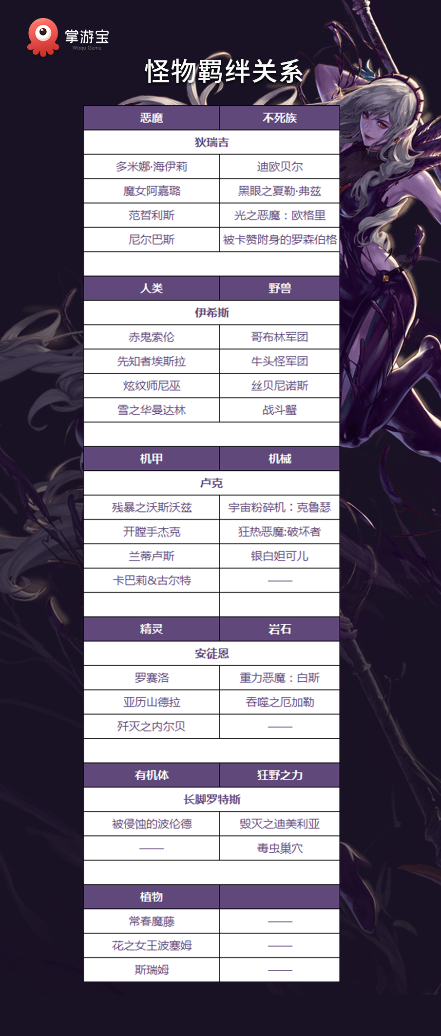 虽然怪物的本身强度很重要,但是不考虑羁绊属性的话,会导致你的资源分配不均,打低配的时候感觉不出来,等到了排位和后期爬塔的阶段就会明显感觉乏力。怪物羁绊关系: