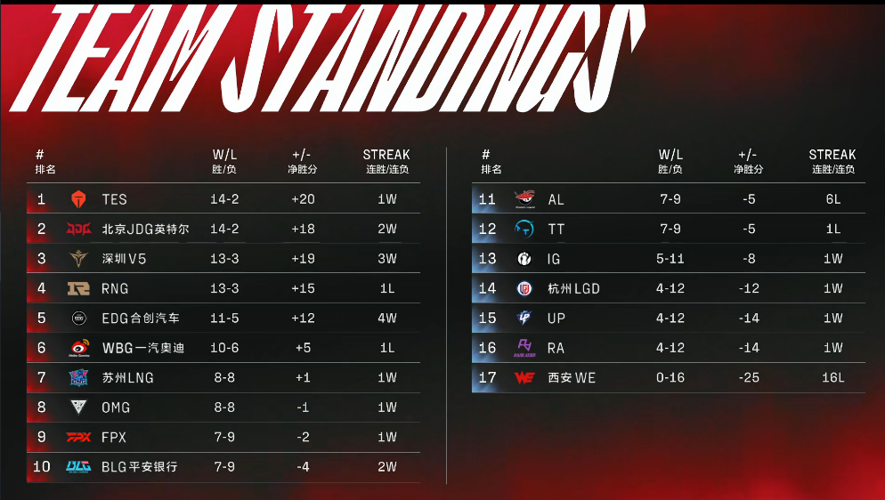 北京时间8月14日,随着“水鬼”LGD战队逆天改命击败RNG战队之后,RNG错失复活甲,JDG战队则直接可以开香槟了(LGD战胜RNG之后,JDG喜提复活甲)。最终,2022LPL夏季赛常规赛积分榜排名如下: