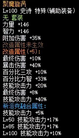 在100级版本初步登陆后玩家们就研究出魔战无双搭配改造左槽达到淘汰装备再利用并比当初普遍装备不齐时伤害更高的效果。事实上并不止魔战无双套装可以借由智慧的产物进行“复活”,85级史诗套装和95级史诗套装中的许多都可以通过旧智慧的产物成为媲美100级装备的属性为我们再度服役。这一类智慧的产物往往是将原有的旧史诗装备装备等级提升至LV100,再通过改造增加伤害词条来弥补旧史诗装备伤害不足的问题。如“聚魔旋涡”装备改造达到5阶段就可提供近150%的伤害词条和60%的技能攻击力词条,大幅度提高了魔战无双的伤害强度,同时适用魔战无双的减少冷却效果,在实战中快乐加倍。