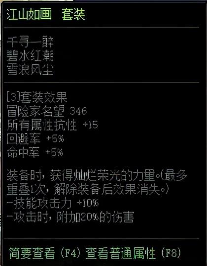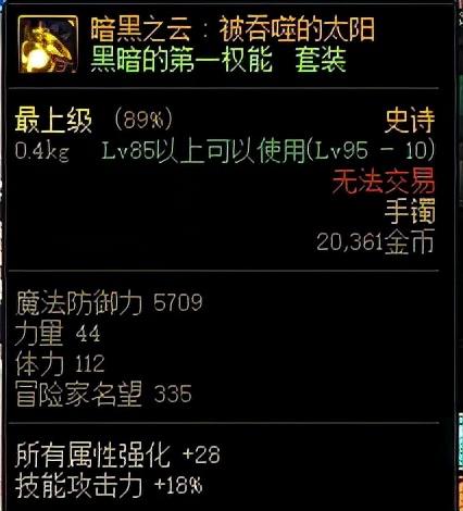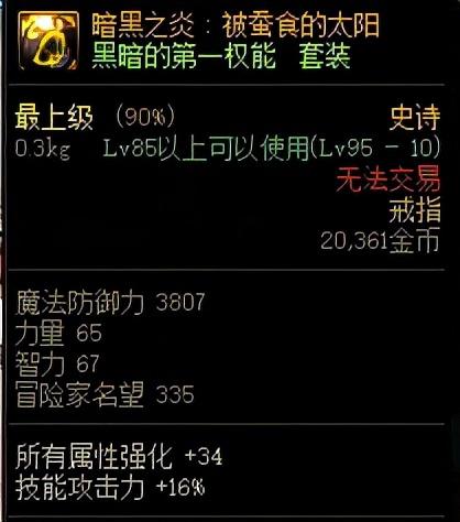 那么说回我们的重头戏,江山如画史诗套装。先介绍一下95版本装备的升级机制。勇士们可以通过攻坚普雷·伊希斯副本将江山如画首饰装备升级为普雷系列“黑暗权能”装备,同时在黑暗权能类史诗首饰套未达成三件套时适用三件套套装效果为江山如画套装效果。也就是说,通过佩戴江山如故智慧的产物史诗获得的江山如画套装效果,也可以适用于未成套的普雷首饰上。下图中的普雷首饰可以看出,黑暗权能装备对于伤害的加成可以说是朴实无华但强力,高额属强加成+技能攻击力加成,完全可以比肩甚至超越100级首饰装备的单件属性。江山如画加成不低的套装属性配合上江山如故改造加成的高额词条便拥有了和100级史诗装备的一战之力,高额的技攻词条让技攻玉更有用武之地,配合智慧的产物升级遴选让这套装备如虎添翼。