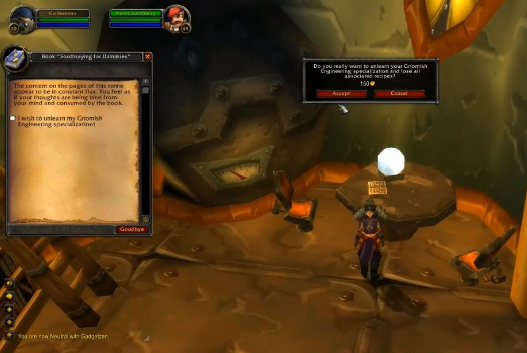 而到了80级地精和侏儒之间的转换会简单很多,在工程学NPC的房间,桌子上有一本可以点击的书,打开以后玩家可以自由选择地精或者侏儒,而代价只需要150金。一下子工程学改变专精变得非常简单便捷,只要玩家有金币就可以随意改换,没有任何限制。