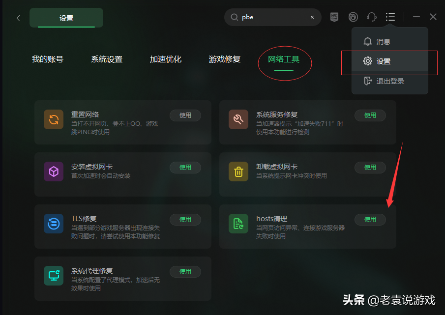 玩家同样可以在奇游加速上面进行操作,打开奇游,点击客户端的右上角,选择设置,再选择网络工具栏,点击使用hosts清理按钮,等修复之后,玩家再重新下载lol美测服pbe即可。