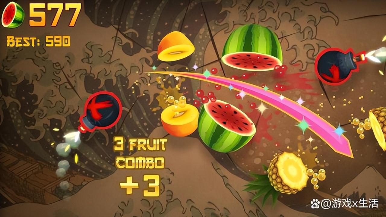 《水果忍者》是由澳大利亚公司Halfbrick Studios开发的一款休闲益智类游戏,于2010年4月20日上线。游戏的玩法也很简单,玩家只需要切水果,切得越多分数越高。游戏有两种模式:经典模式和街机模式。经典模式中无时间限制,水果和炸弹会不间断出现在屏幕上,玩家只有三次没有切到水果的机会,而且只要切到炸弹游戏就结束;街机模式中有60S时间,会同时出现水果和炸弹,切到一个炸弹不会导致游戏结束而是扣10分并减少时间,同时会出现三种辅助香蕉道具。游戏在后期也推出了PC版以及VR版。