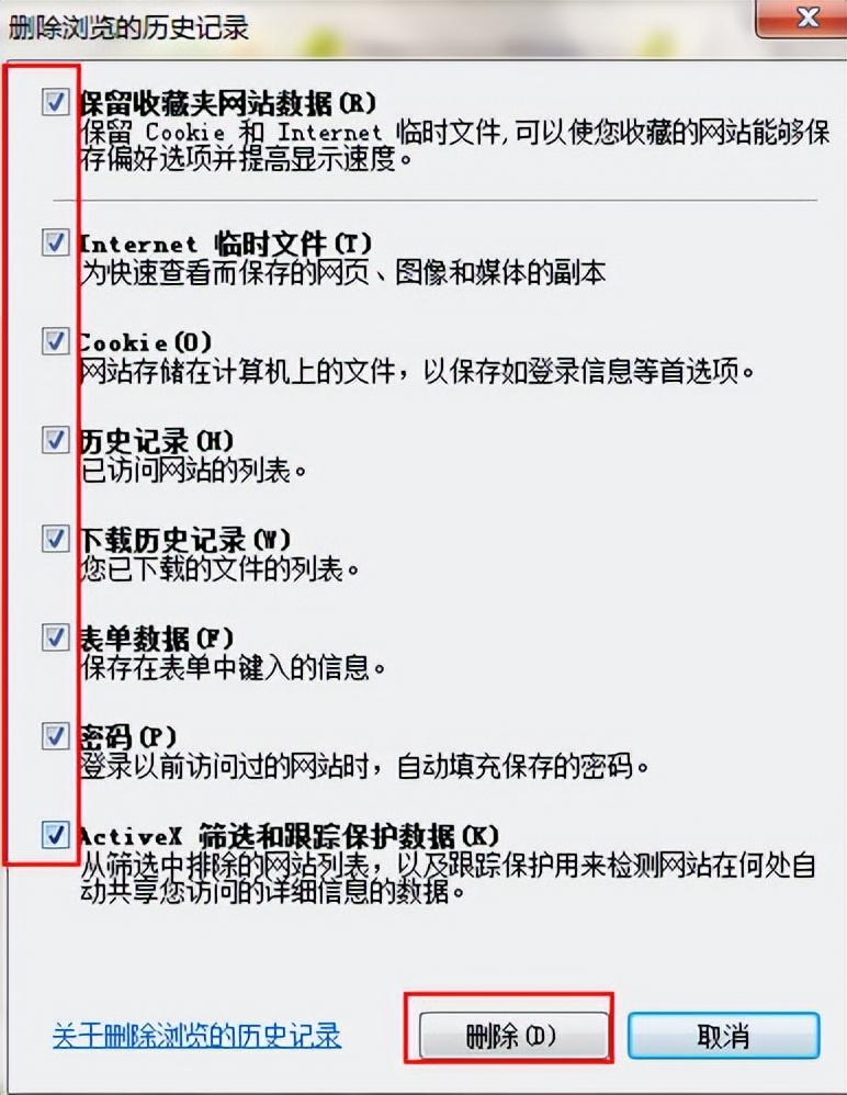 3、勾选所有的选项,点击“删除”按钮,如下图所示: