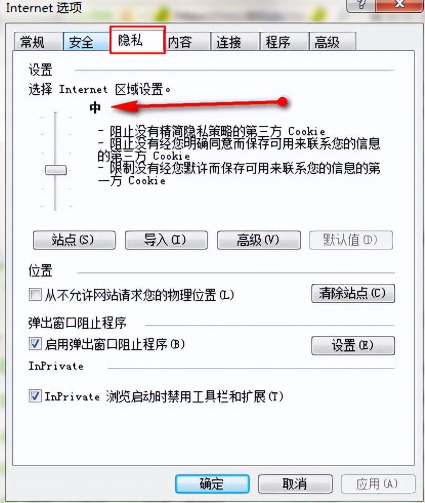 4、切换到隐私栏,将“选择Internet区域设置”调为“中”,如下图所示: