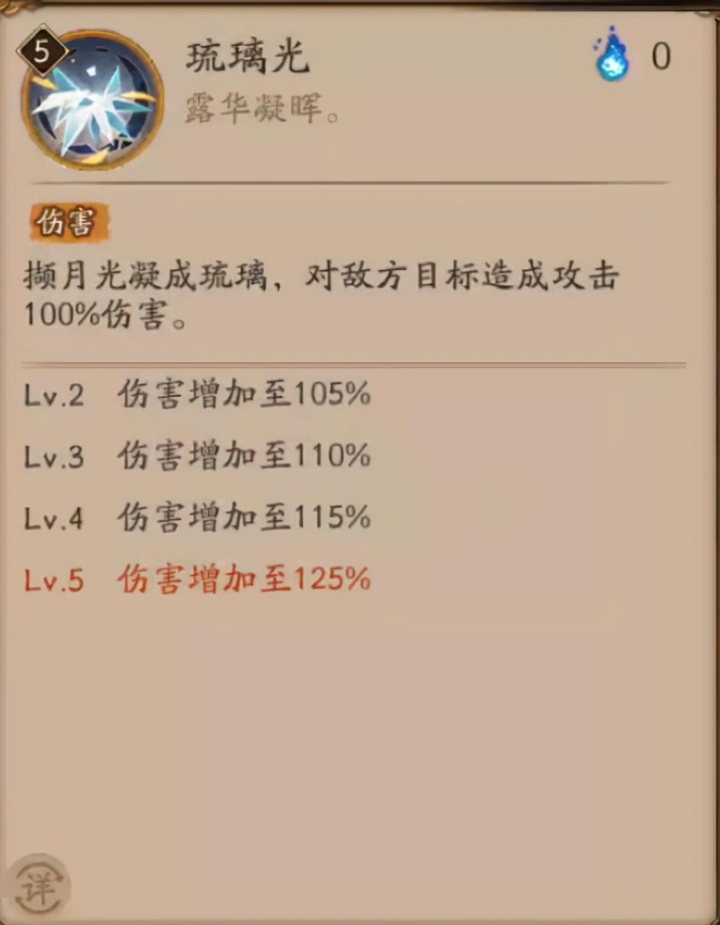 接下来看看技能,一技能【琉璃光】,普攻技,升满级后只增加伤害系数。这个技能无特殊,如果不是要解锁传记的话,可以不喂满。