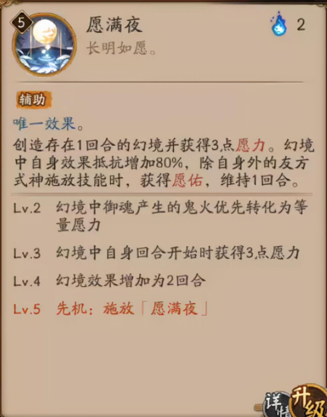 这个技能升满级的效果是先机放愿满夜,幻境持续回合增加到2回合,并且在幻境中自身回合开始时获得3点愿力,在幻境中御魂产生的鬼火优先转化为等量愿力。