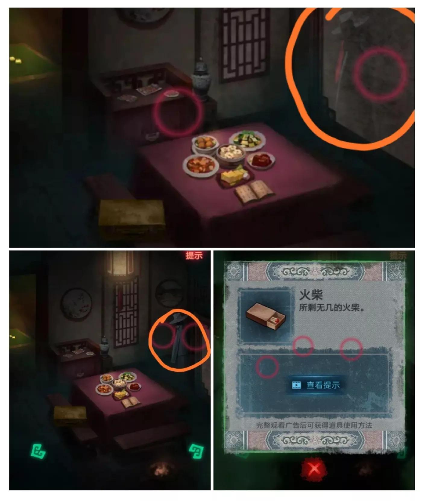 2.跟着剪头来到有一桌菜的房子里,右边墙角有一个假人,点假人得到一盒火柴。