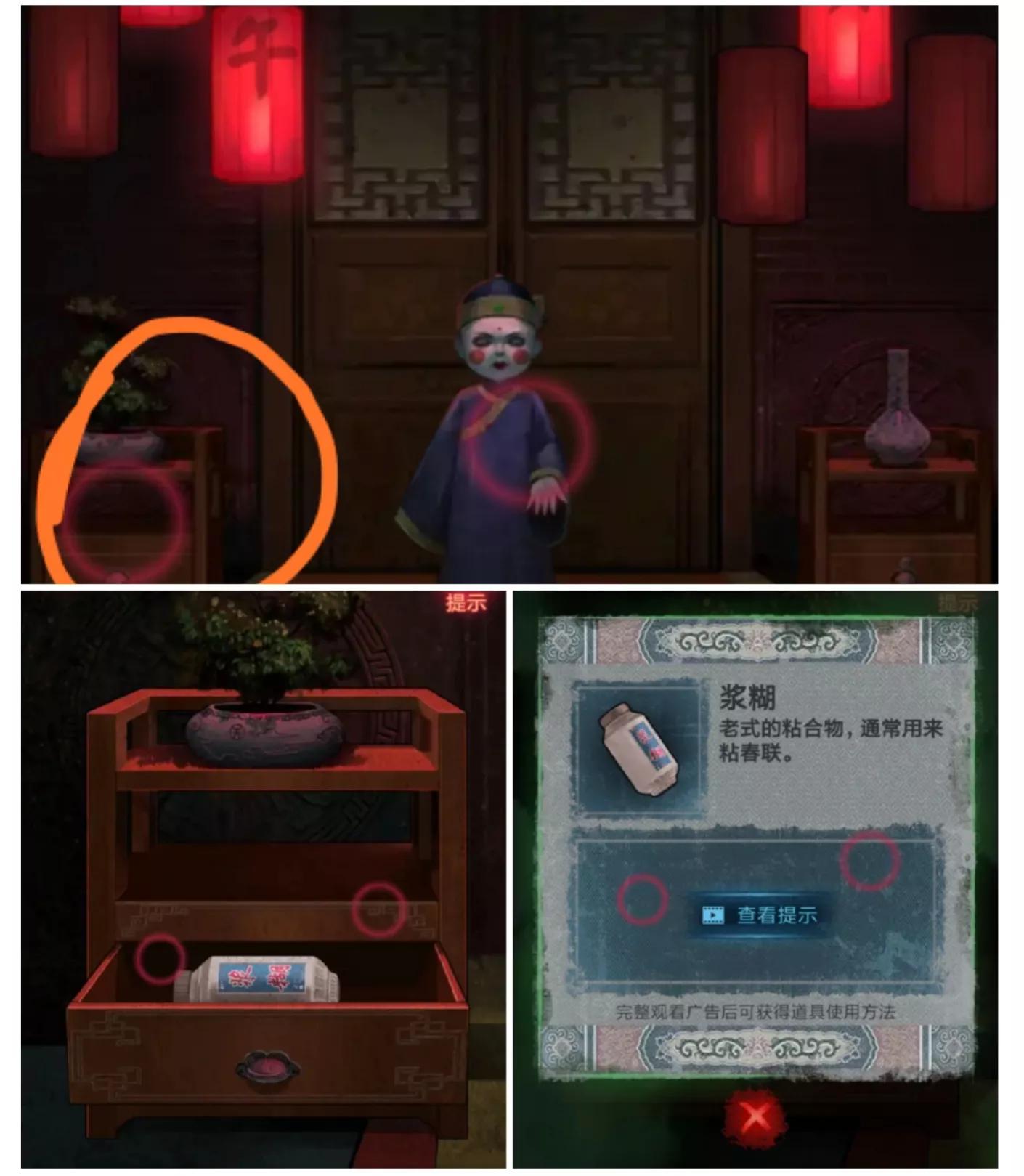 3.点右边绿剪头来到挂有小纸人和红灯笼的房间,点到左边的柜子的抽屉,得到一瓶胶水。