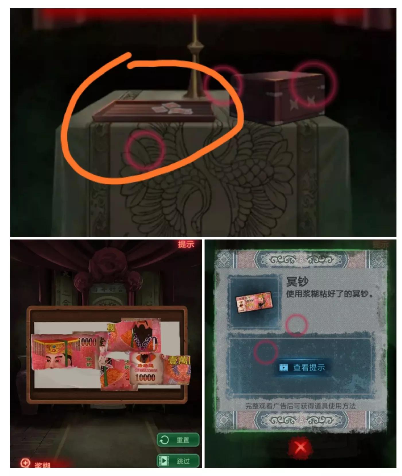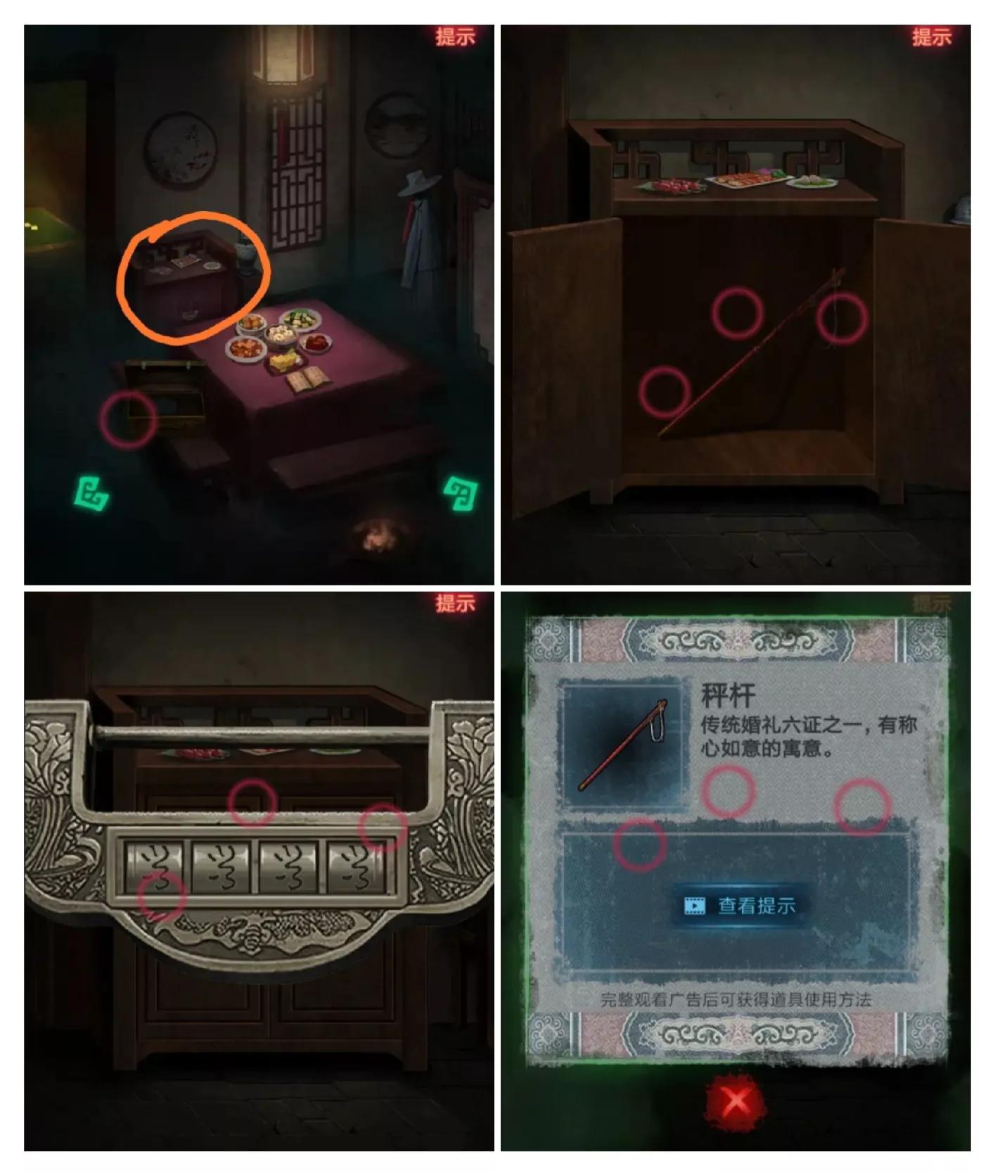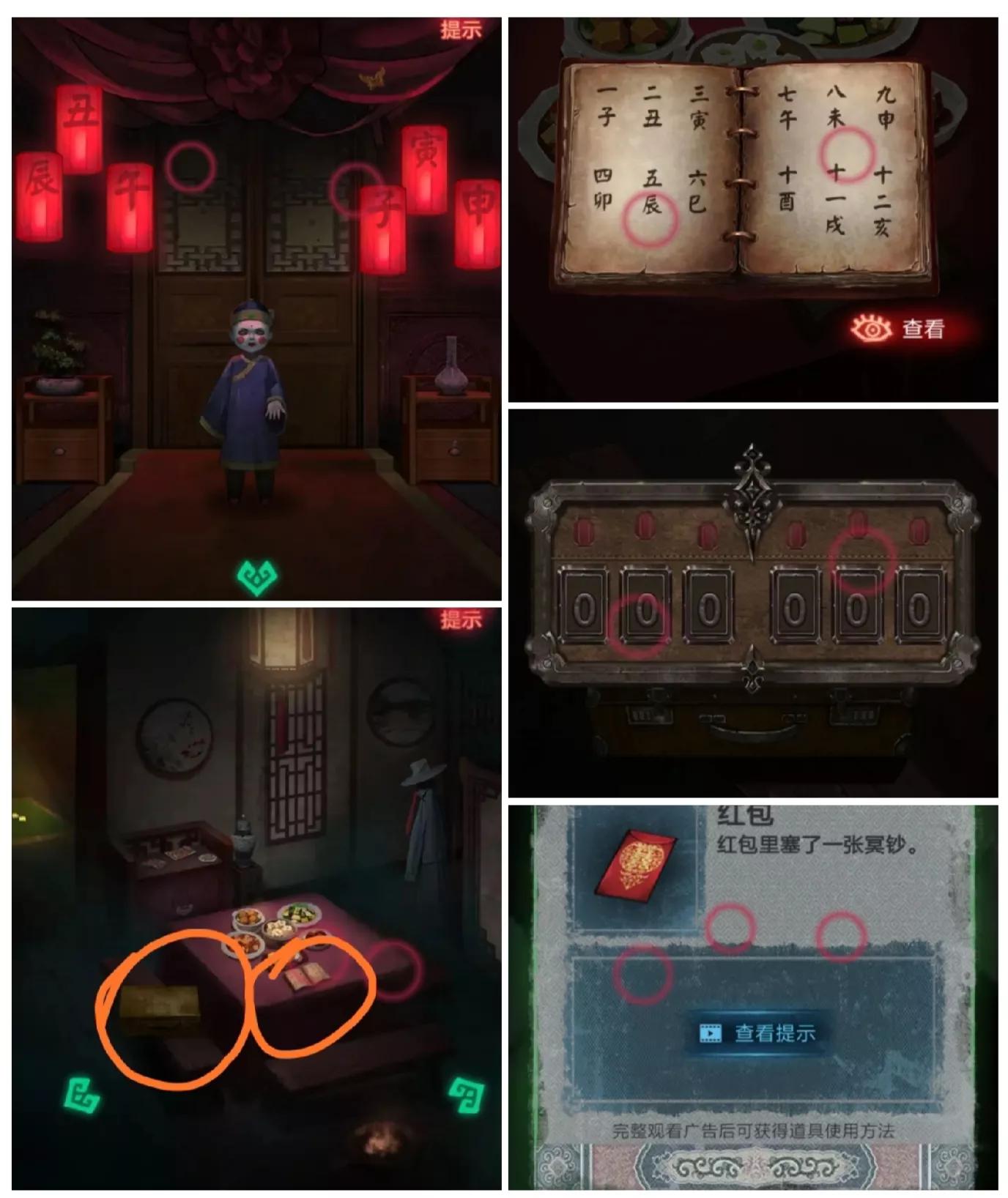 5.去有6个红灯笼的房间(以下简称红灯笼房),用刚才得到的火柴点亮灯笼里的蜡烛,最右边角角上的的灯笼缺一根蜡烛,把刚才得到的蜡烛放进去并点亮,得到(辰 丑 午 子 寅 申),再回到桌子上有菜的房间,桌子上有一本书打开后对应灯笼上得到的字得到(527,139)六个数字,点击凳子上的箱子,输入密码,箱子里有一个空红包,把冥币塞进去得到一个红包。