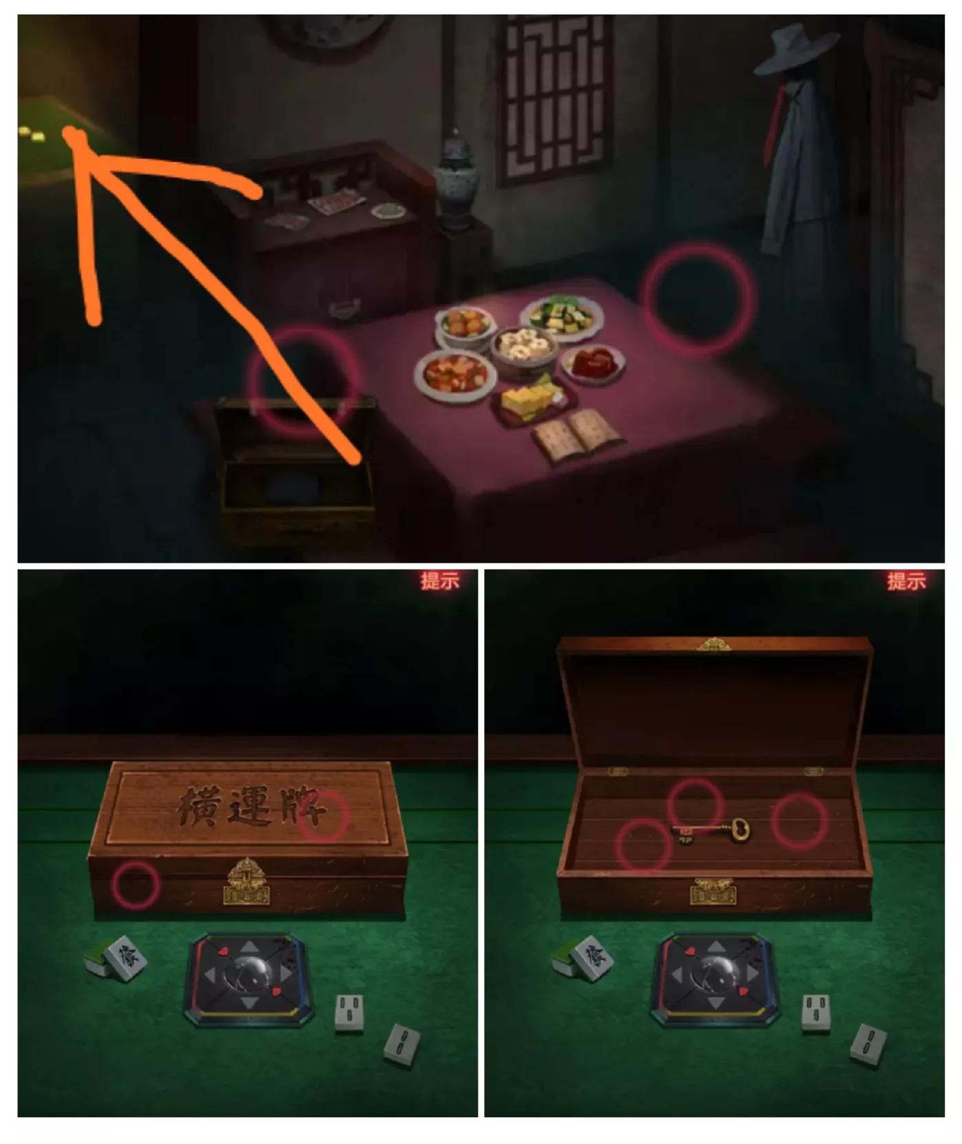 7.去有菜的房间,左上角有一间小房子,进去后桌子上有三个麻将和一个罗盘一样的的东西,根据罗盘上的红点,得到桌子上盒子密码是(发 3条 2条),打开盒子得到一把钥匙。