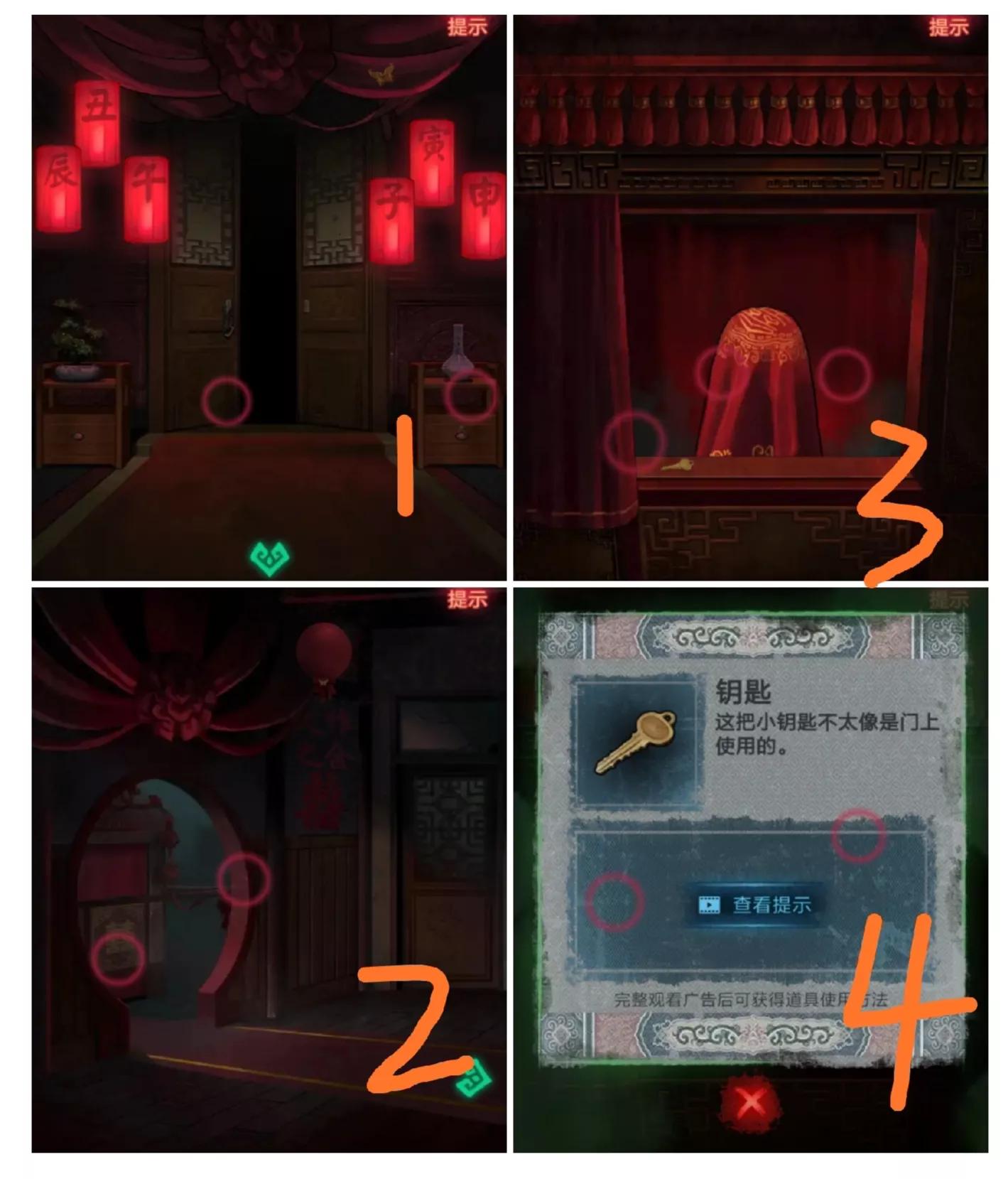 8.拿着这把钥匙去红灯笼房,打开门,根据剧情片段,来到了一个有轿子的房间(以下简称轿子房),来带轿子旁边,撩开轿子窗户的红布,上边有一把钥匙。