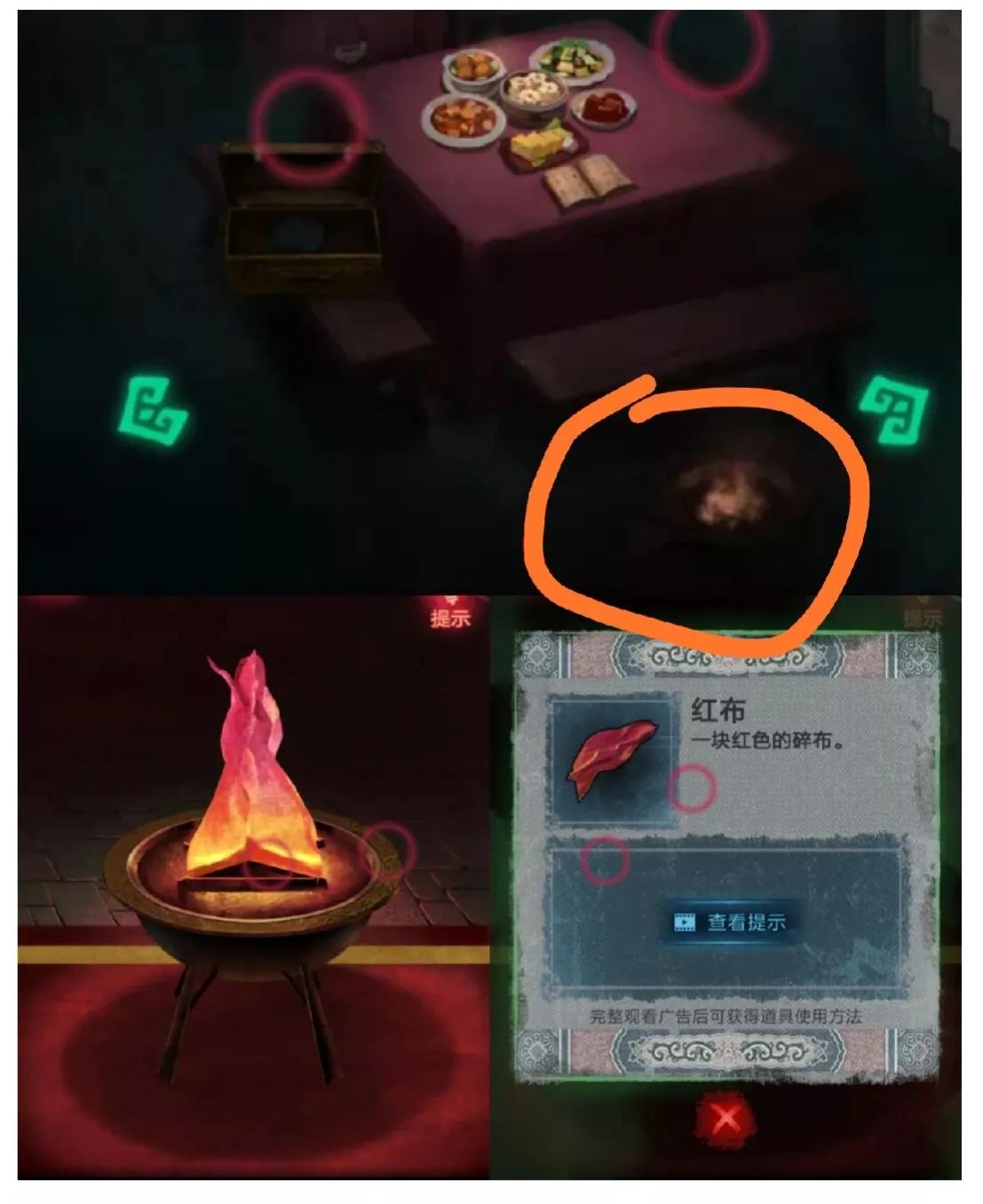 10.拿着剪刀来到有菜的房间,点开桌子下边的火盆,用剪刀剪火苗,得到一块红布。