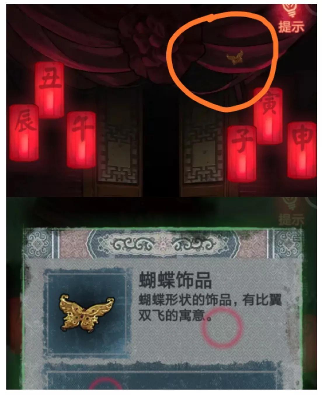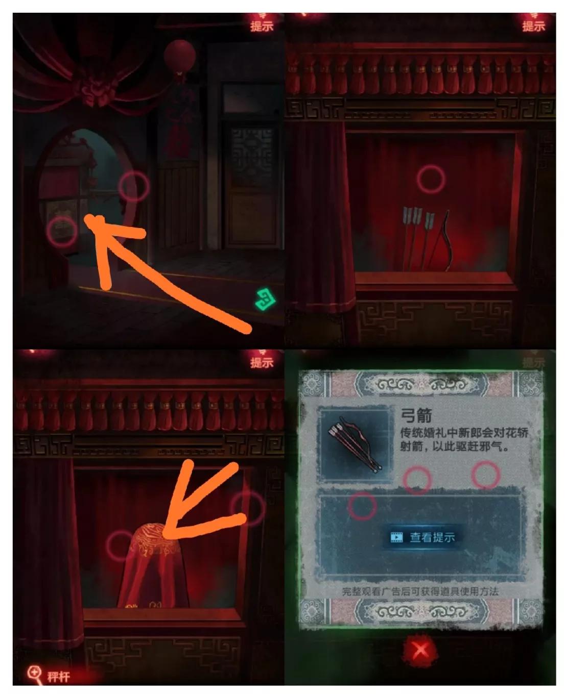 14.去轿子房间,用撑杆勾开新娘盖头,得到弓和箭,来到轿子旁边的房间,门口挂了一个小灯笼,用箭射它,掉下另外一枚蝴蝶饰品。