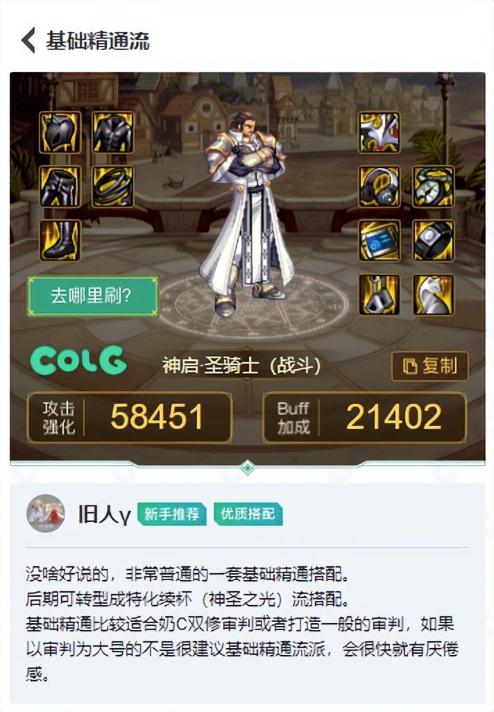 这套基础精通流装备搭配,以极致强化普通攻击作为特色。审判奶爸在上了神罚之锤buff后,普通攻击范围巨大且手感非常不错,非常贴合这套基础精通流。对于处在过渡期或打造一般的审判玩家来说,这套基础精通流可以带来不错的刷图能力!