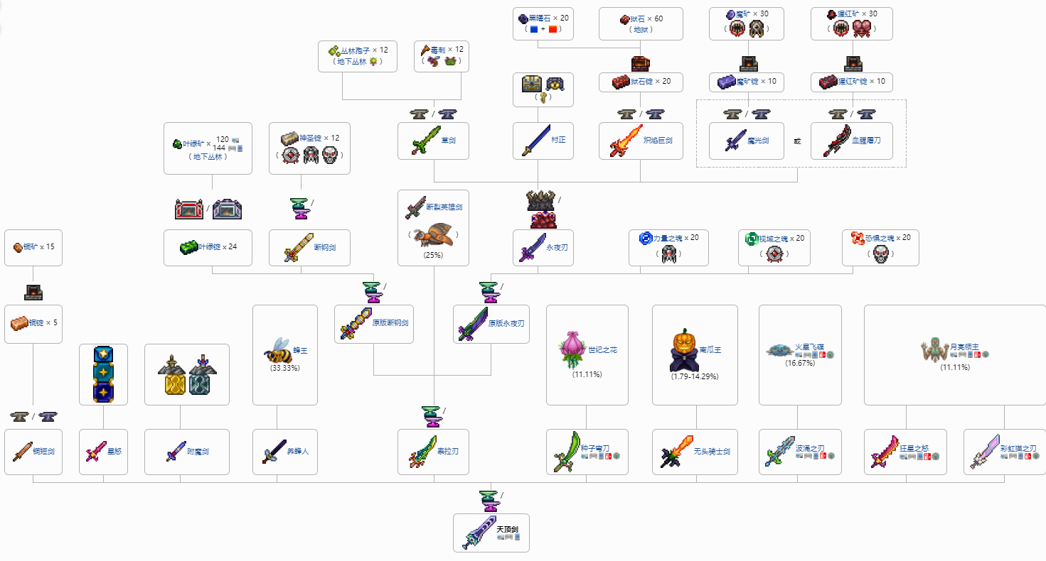 好了,以上就是合成天顶剑的所有剑的获取方式,其中铜短剑、星怒、附魔剑都可以通过取巧的方式获得,而其他的养蜂人、泰拉刃、种子弯刀、无头骑士剑、波涌之刃、狂星之怒与彩虹猫之刃。可以说都需要大量的肝才能获得了。最后不二祝大家早日毕业拿到这把泰拉瑞亚中的最终武器。
