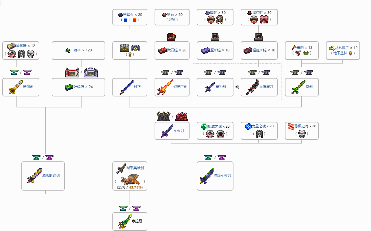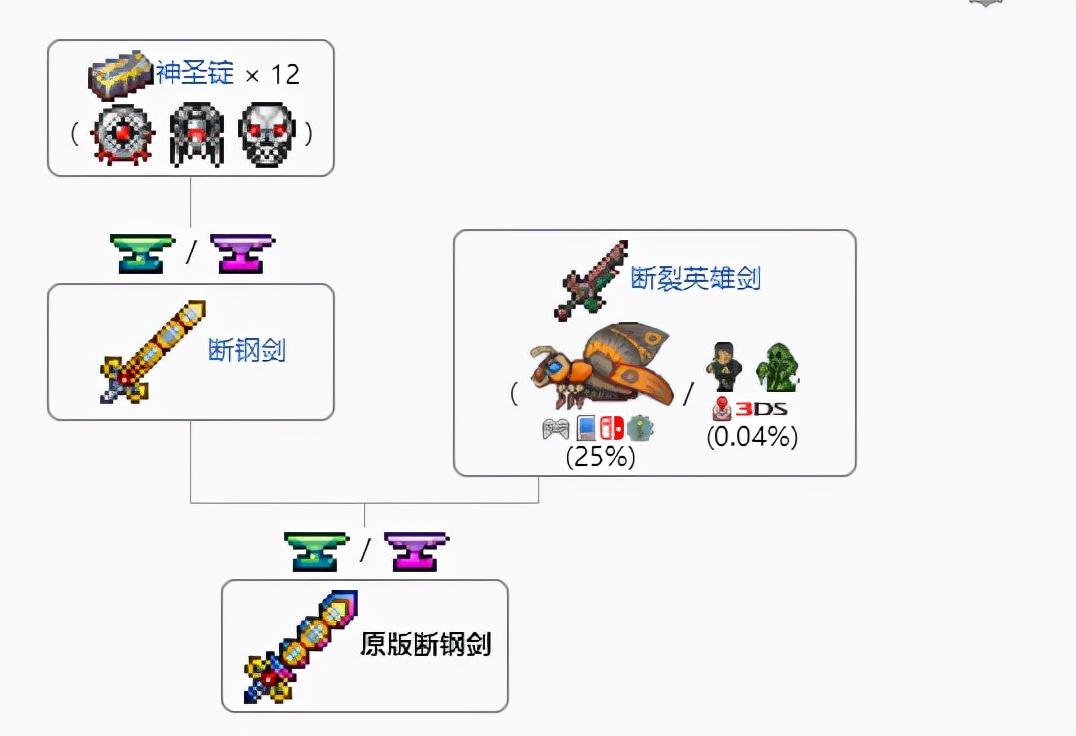 最后讲一下泰拉刃的获取,泰拉刃由原版断钢剑与原版永夜刃合成,原版断钢剑则由断钢剑与断裂英雄剑合成。断钢剑由机械三王掉落的神圣锭合成。断裂英雄剑则在击杀日食时出现的蛾怪有25%的概率掉落。