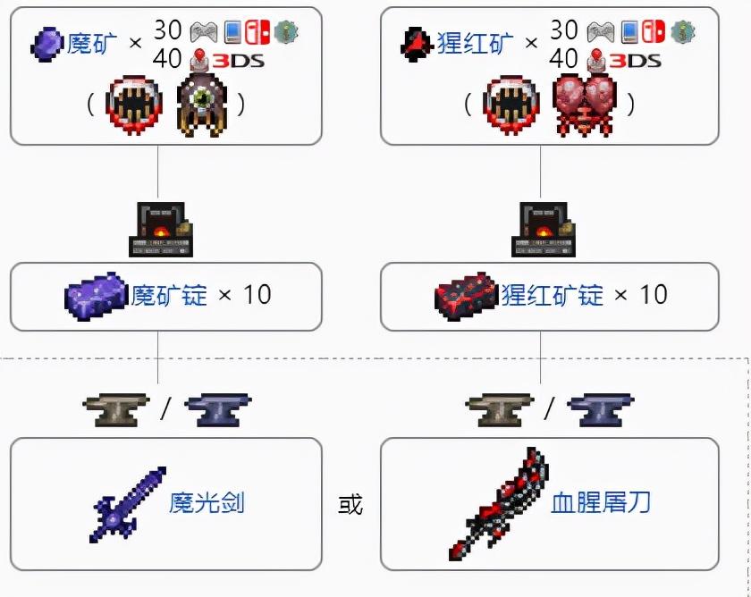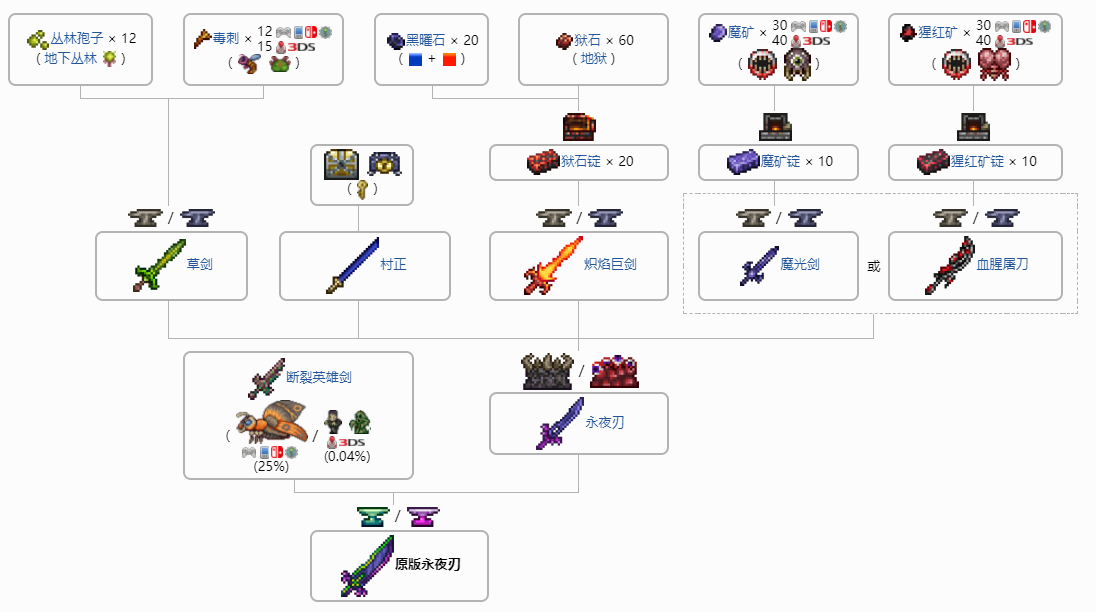 原版永夜刃则需要永夜刃与20个由机械三boss掉落的力量之魂、视域之魂与恐惧之魂合成,永夜刃则由草剑、村正、炽焰巨剑、魔光剑或血腥屠刀合成。