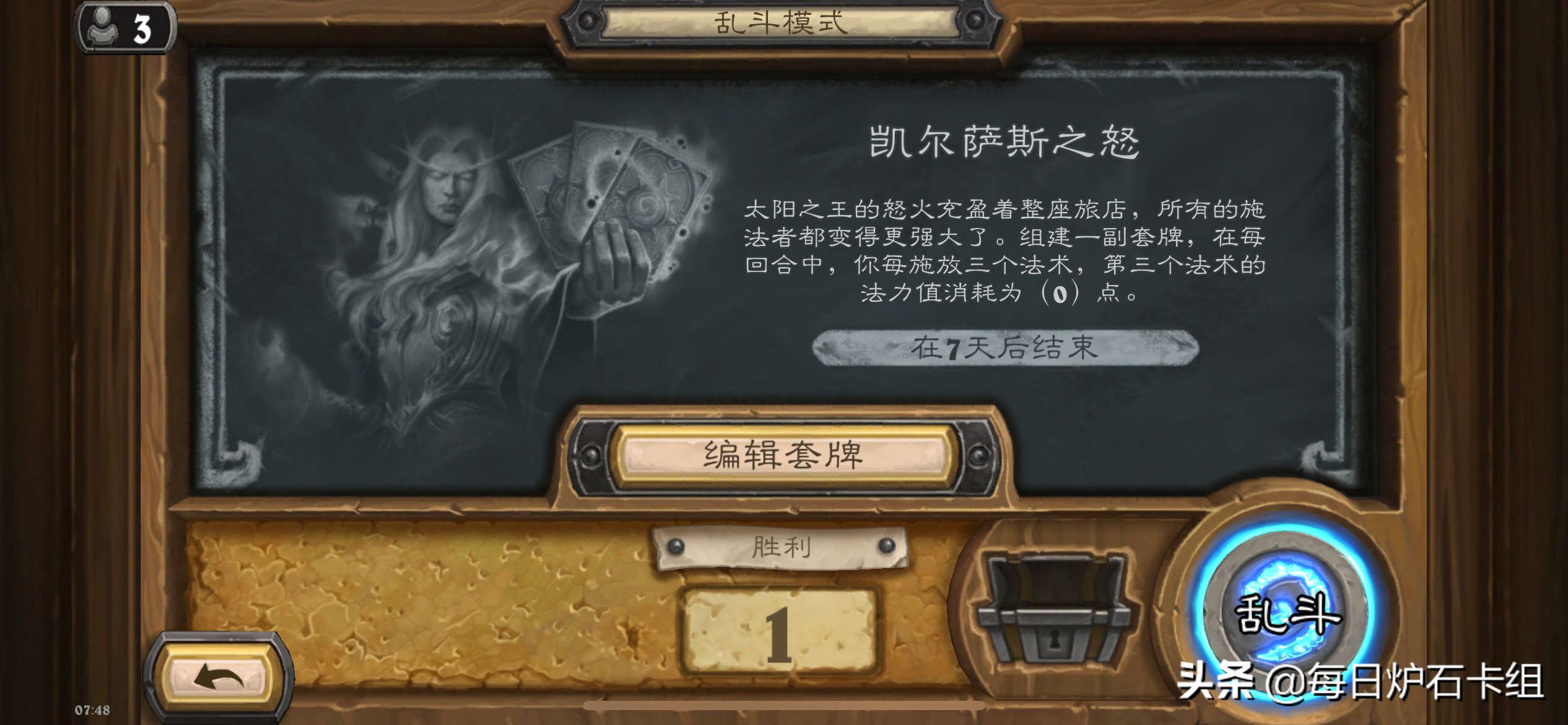 不知不觉,又到周四乱斗模式更新的日子。本周的乱斗是【凯尔萨斯之怒】,之前曾经出现过,不过卡池从狂野变更为了标准。效果是削弱前的凯尔萨斯,每回合第三个施放的法术法力值消耗为0点。首胜奖励依旧是一包凤凰年卡牌包。