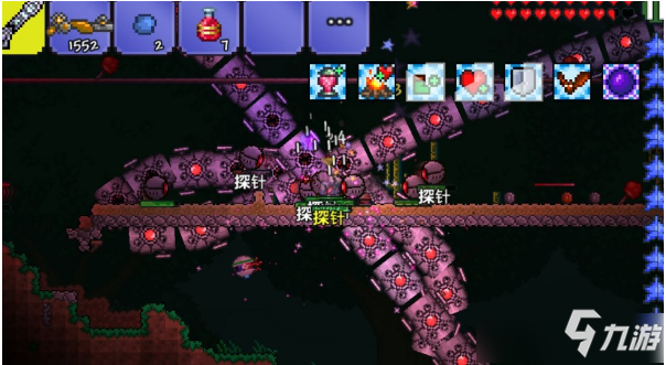 2、然后等到游戏里晚上的7点半之后,直接在背包里面点击机械蠕虫的道具,就可以进行召唤了,我们在攻略这个boss的时候最好搭个平台来打,不然很危险;