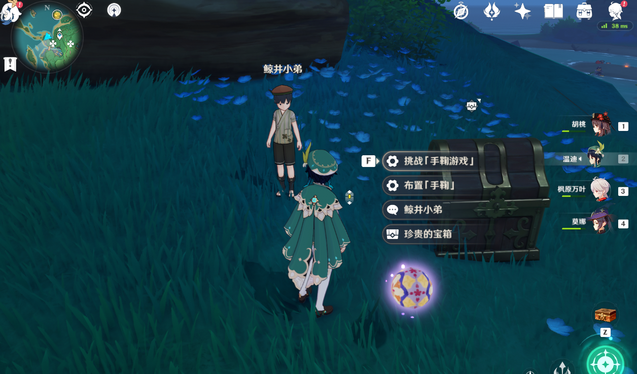 (任务完成后,后续各地区还有六个鲸井小弟,找到他交谈,完成三次手鞠游戏获得,并且开放该地点联机和好友一起玩【手鞠游戏】功能。)